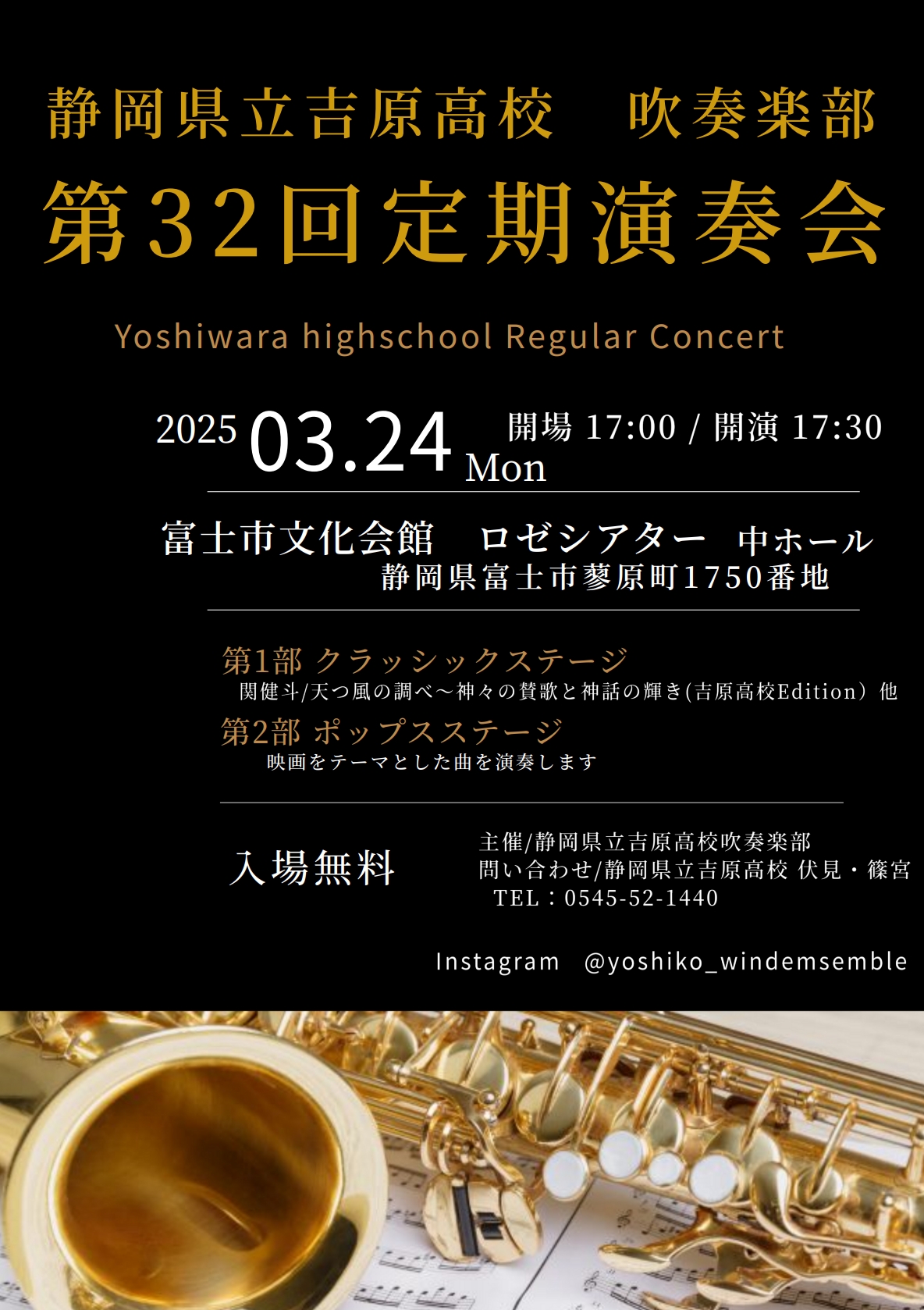 吹奏楽部定期演奏会のお知らせ お知らせ 2025.01.192026.01.24 2025年3月24日(月) 開場 17:00 開演 17:30 富士市文化会館ロゼシアター 中ホール 入場無料 ※会場受付にて「同窓会」とお伝えくださいませ。 【講演内容】 第一部 クラッシックステージ 第二部 ポップステージ 映画音楽を中心に演奏します。 吹奏楽部の皆さんが、毎日演奏の練習や準備に励んでおります。 当日は心を込めて演奏してくださいますので、是非皆様のお越しをお待ちしております。