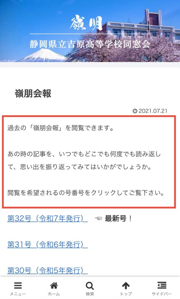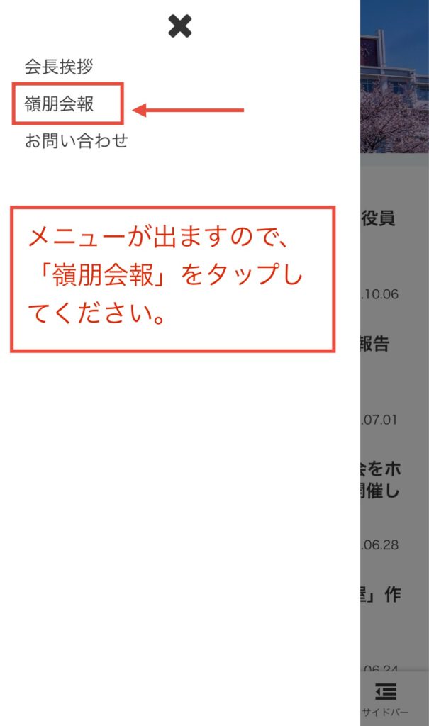 ホームページをリニューアルいたしました お知らせ 2026.01.13 ホームページをリニューアルいたしました。 今まで同様に、活動内容を随時投稿してまいります。 尚、スマホで「嶺朋会報」を閲覧される方は、下記の手順に従って記事をお楽しみください。 ① ② ③ 近々、最新号発行の予定となっておりますので、楽しみにお待ちください。
