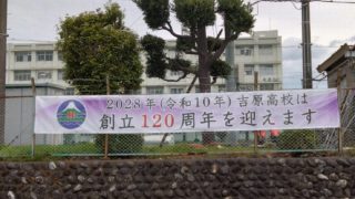 吉原高校は2028年(令和10年)に創立120周年を迎えます。 4月に入りその横断幕が学校正門横の道路沿い(校名看板の東側)に設置されました。 同窓会としましても、今後予定されている記念事業に協力して参ります。 ぜひ同窓生一丸で盛り上げてい...